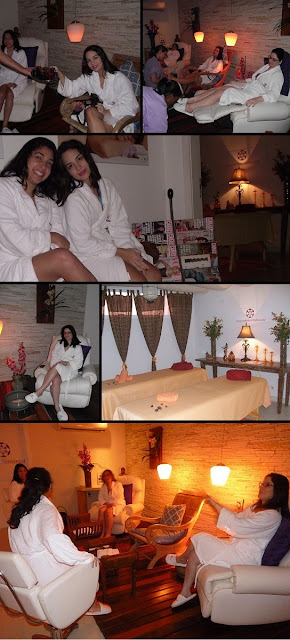 Fomos eu, Ana, Thaís, Ju e Luciana. Ao chegar já fomos recepcionadas super bem e o "serviço" começou. Primeiro uma leve massagem nos ombros com uma toalha quentinha e perfumada. Depois uma esfoliação corporal show de bola! Um tempinho na sauna para completar essa esfoliação, abrir os poros e fofocarmos bastante! Achei que fosse ser tenso mostrar minha barriga branca (ou grande?!) mas estar entre pessoas queridas é bom demais! Nem liguei e coloquei a pança para jogo mesmo! hahahaha